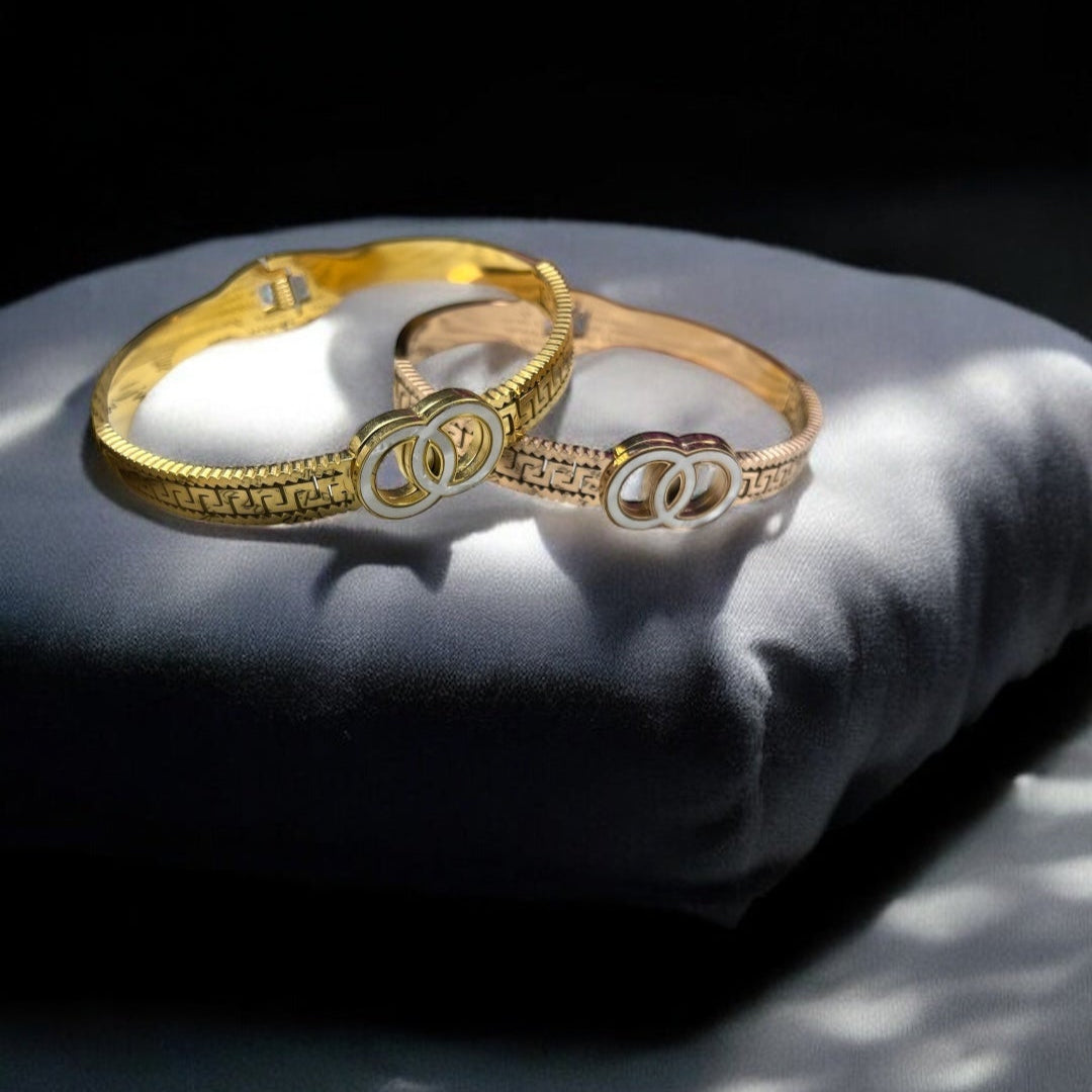 Make a bold yet elegant statement with the Designer Cuff Bracelet – a perfect blend of tradition and modern style. This stunning gold bracelet features a sleek cuff design accented with graceful entwined hoops, symbolizing unity and everlasting connection. The engraved Greek key pattern adds a touch of cultural elegance, making this designer bracelet truly unique.