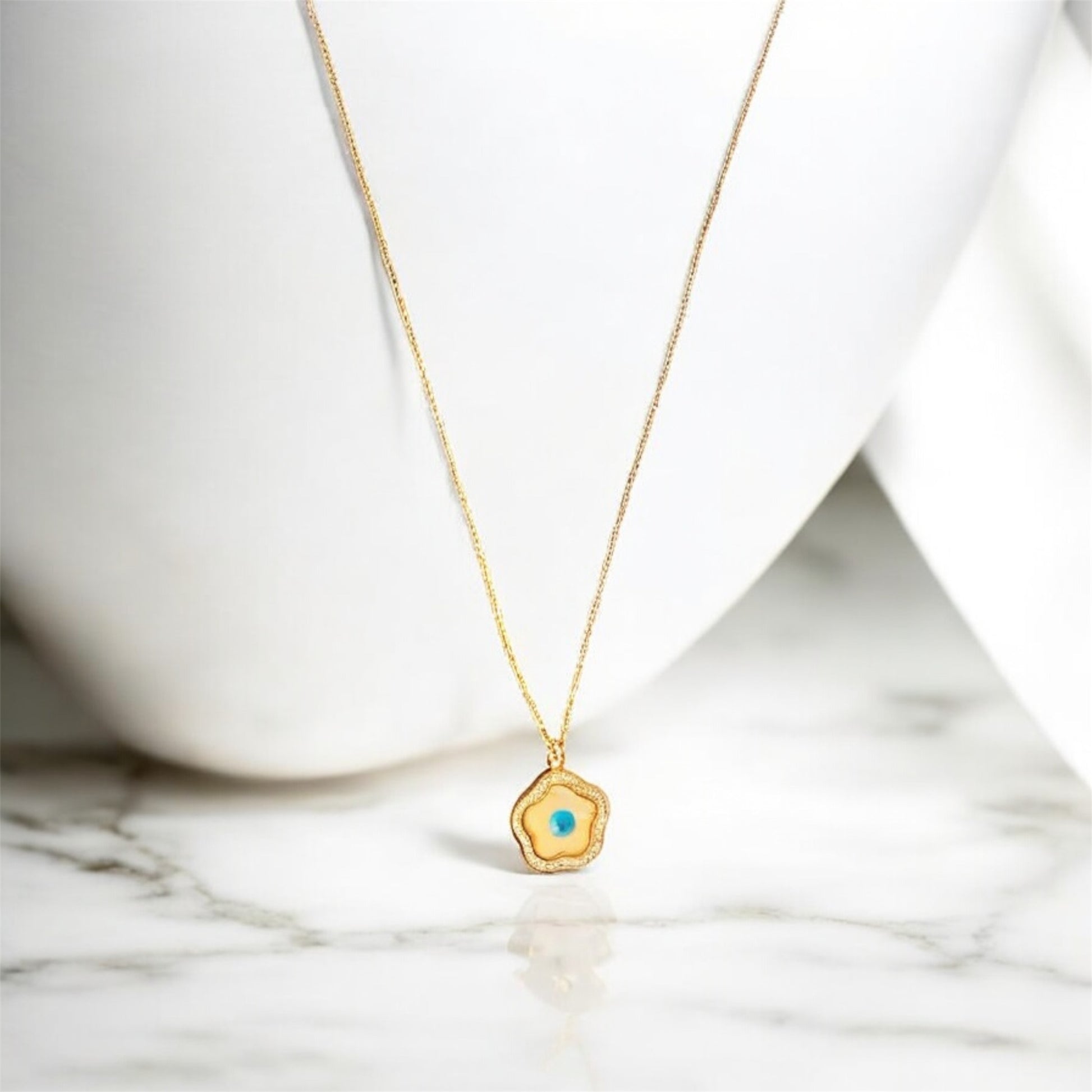 Step into protection and style with the Evil Eye Flower Necklace, an elegant fusion of ancient symbolism and modern design. Crafted in a stunning flower shape, this gold necklace features a prominent blue evil eye at its center — believed to ward off negativity and bring positive energy. Made with anti-tarnish gold plating, this necklace for women remains as beautiful as your first wear. A statement piece that blends spirituality with sophistication, this necklace is perfect for both daily wear and special occasions.