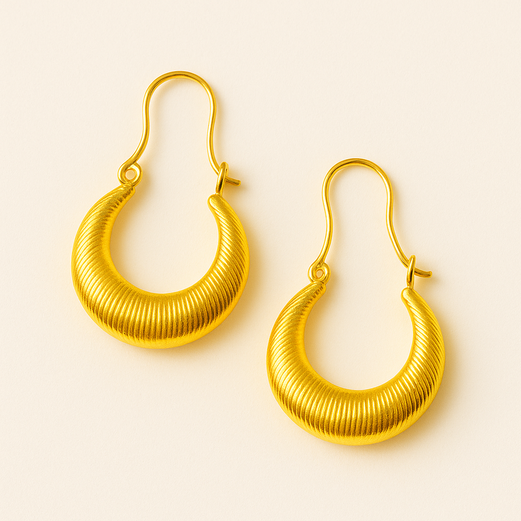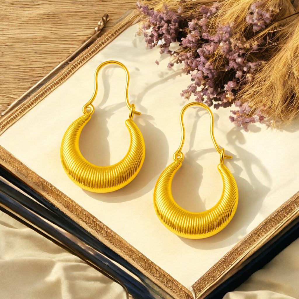 Step into timeless elegance with these Gold Crescent Hoop Earrings for Women, featuring a beautifully textured round drop hoop design and a premium 18K gold plated finish. Lightweight and comfortable for everyday wear, these anti-tarnish gold earrings come with a secure fish hook closure, offering a perfect blend of modern gold jewelry and vintage style earrings. Whether you're dressing up for weddings or festivals or just want a pair of stylish earrings for women to wear daily, these lightweight gold earrings are a must-have. They also make an ideal gift for her, combining luxury with durability.