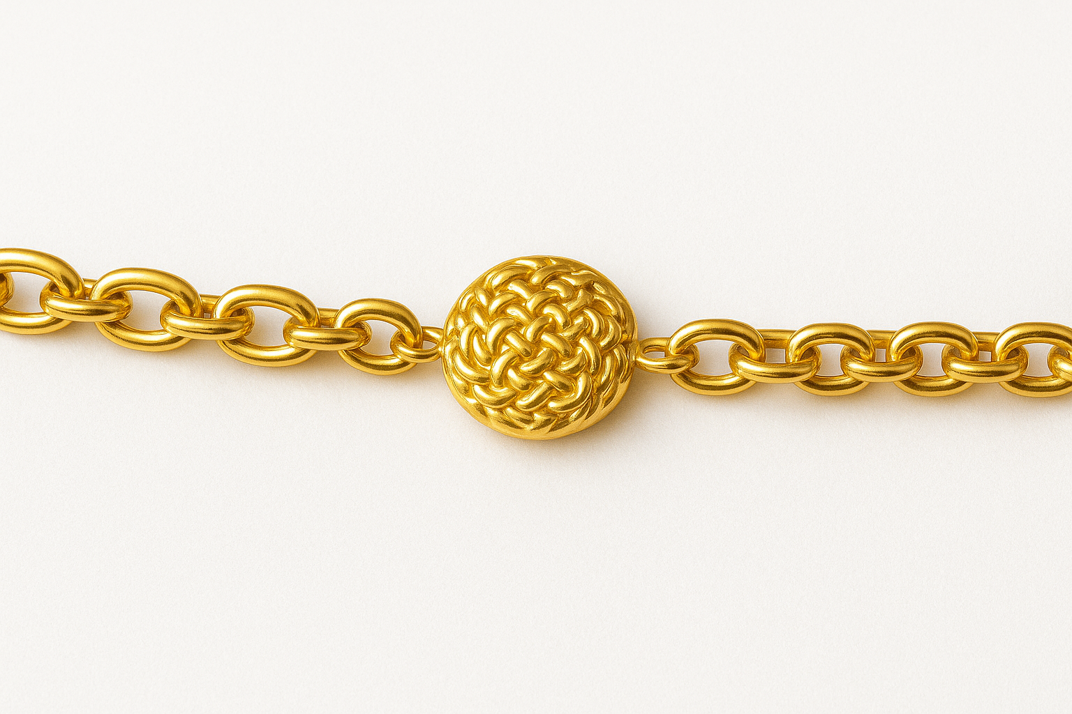 Turn heads with the Golden Knot Luxe Bracelet, a bold fusion of classic elegance and contemporary design. Crafted with a thick designer chain and a beautifully sculpted knot medallion, this 22K gold finish bracelet radiates confidence and grace. Its anti-tarnish technology ensures long-lasting shine, making it perfect for everyday use and festive occasions alike. The adjustable link clasp provides a comfortable fit for all wrist sizes, while the luxurious golden texture elevates even the simplest outfit. Whether you're curating a personal collection or looking for a thoughtful bracelet gift for women, this stylish piece adds an effortlessly refined touch.