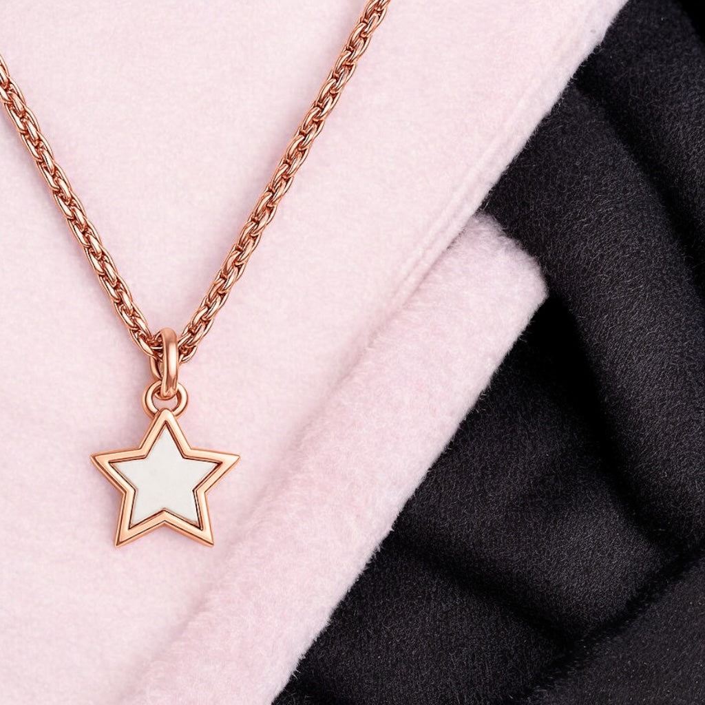 Shine bright with the Starlight Rose Gold Necklace for Women and Girls, a delicate star pendant necklace that adds effortless charm to any look. This rose gold necklace features a beautifully crafted star charm with a glossy white enamel center, giving it a modern yet elegant touch.